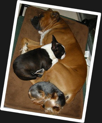 Magic (Yorkie) is more like a squirrel than a dog and can run as much as his big brother Bucho (Boxer) can but also can climb to places you wouldn't believe is possible while Bucho stays with all his four paws on the floor at all times. Luigi (Boston Terrier) is a "thinker" (stinker too!) that always has to think before doing something to figure out is it worth it.
